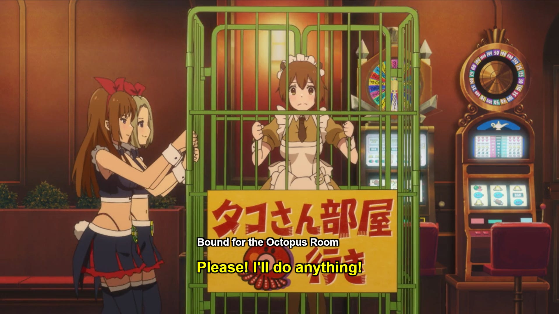 For most of its run, Akiba Maid War is a pitch-black situation comedy. Every week the girls and their never-named manager come up with some desperate, ill-advised plan to get rich quick and take their cafe out of the red: gambling at the maid casino, fighting at the underground maid MMA den. Of course there’s a maid version of every mafia racket.