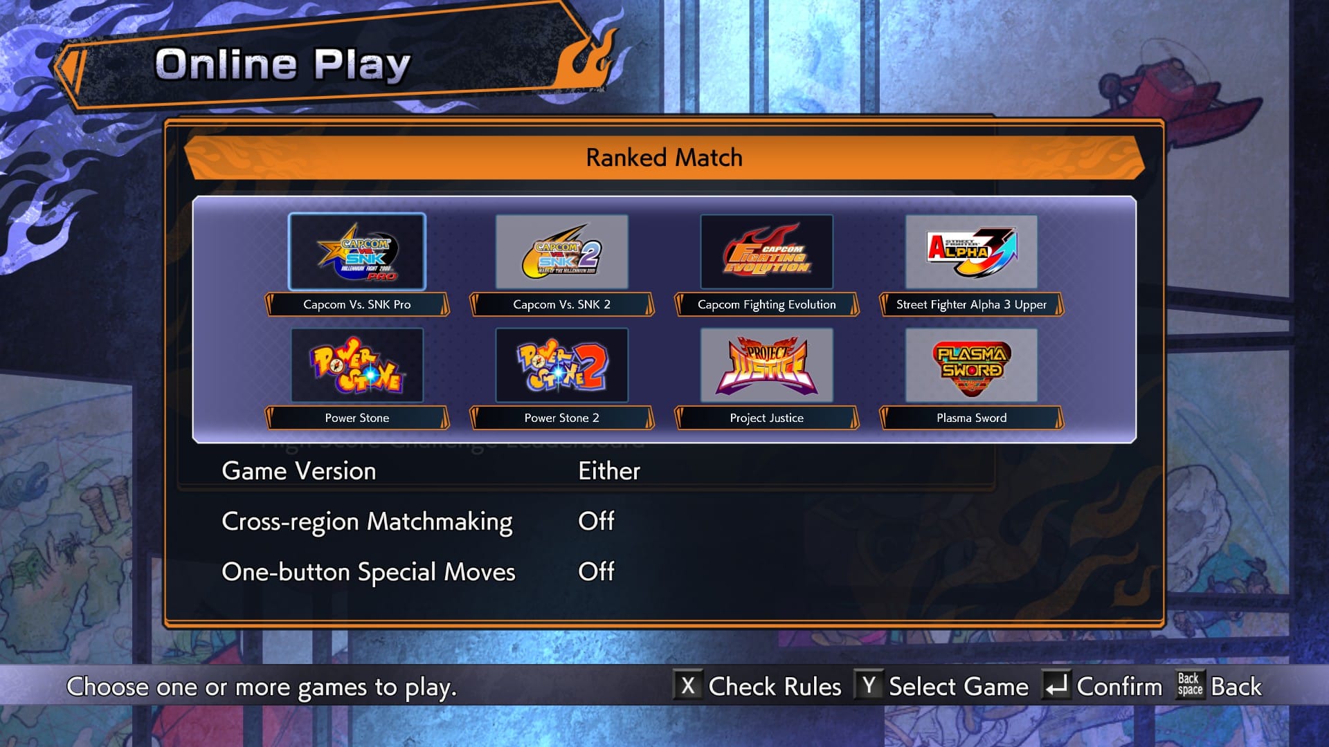 Capcom has also changed the rules of a few of these classics for online ranked play in order to save newbies suffering. Street Fighter Alpha 3 Upper, for example, is a slightly updated version that never left Japan and which was rejected by the competitive community for removing infinite combos and other bugs. Capcom Vs. SNK 2 likewise uses the bug-fixed “EO” upgrade for ranked, in which, among other things, the famous and newbie-obliterating “roll cancel” bug has been removed. I kind of get where they’re coming from with this, given the overwhelming newbie-killing nature of the bugs we’re describing.