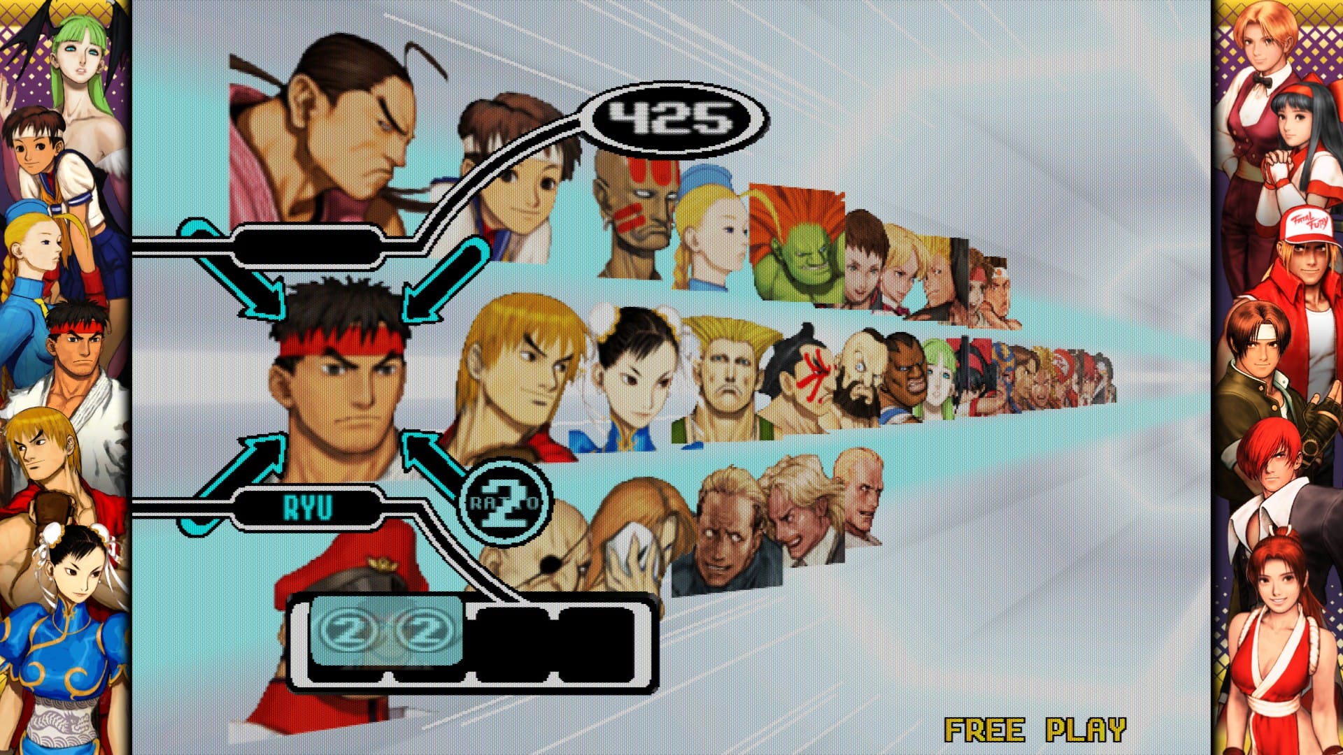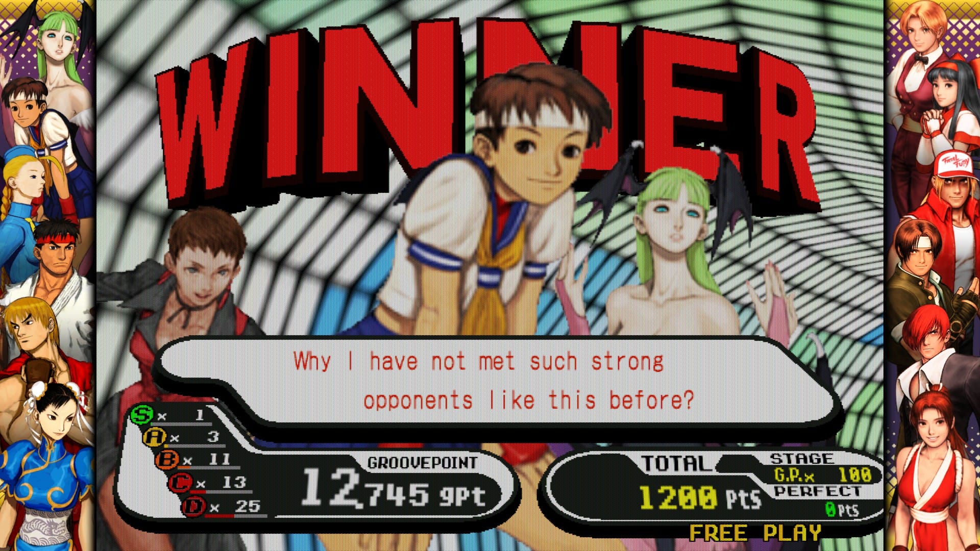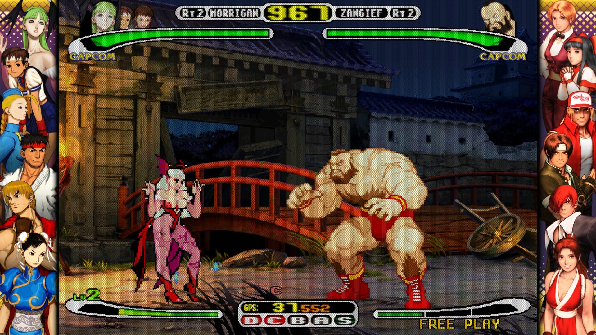 The sequel to Capcom Vs. SNK, instant classic that it is, reverses everything I just complained about. It reverts to the Capcom-standard six buttons, adding lots of new moves to fill out the SNK characters and restoring Street Fighter characters to their full functionality. The “ratio” system becomes the “free ratio” system, in which players can adjust the cost of each character on their own, keeping the general idea of the ratio system intact without restricting players from using their favorite characters.
