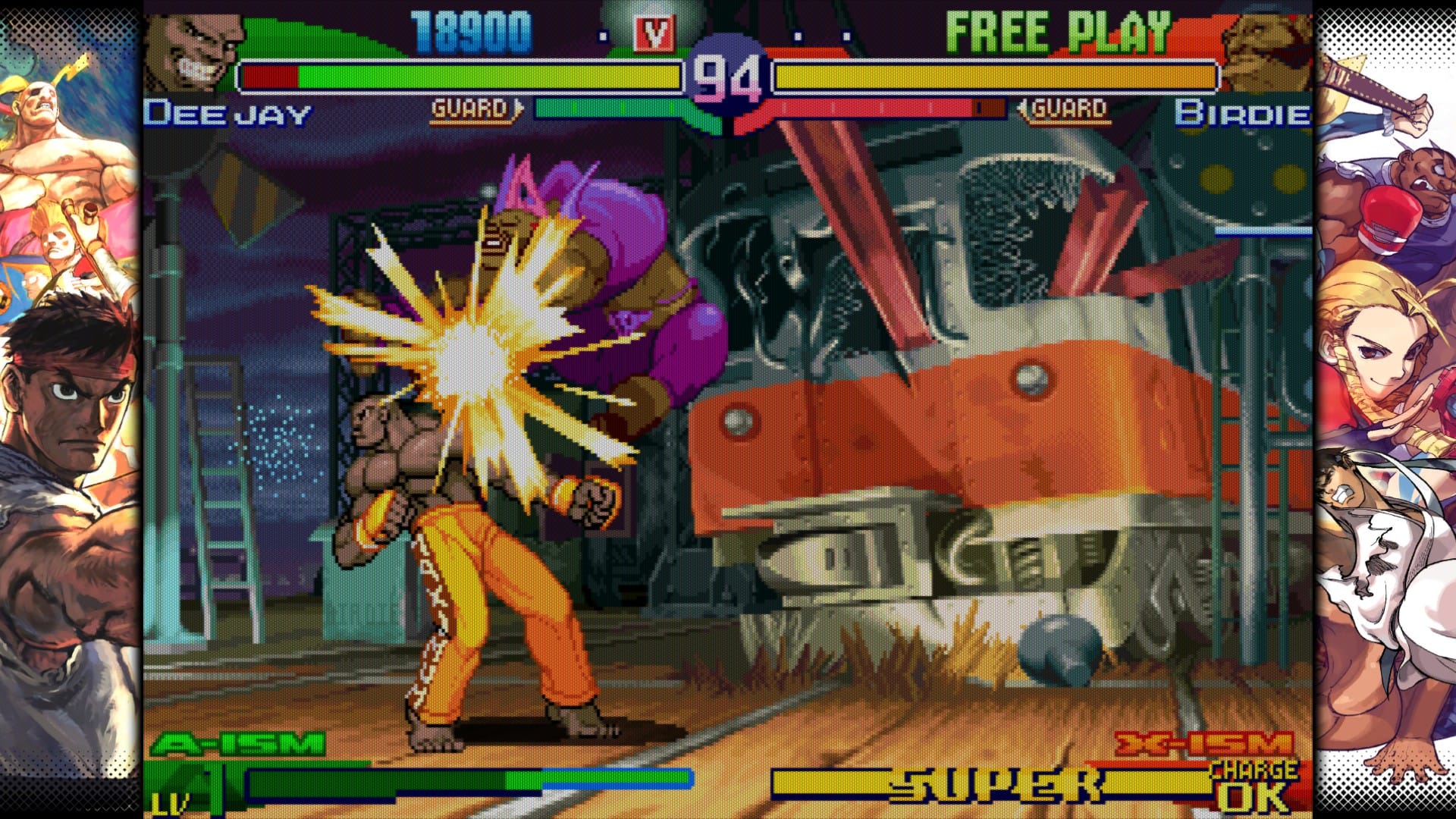 Somewhere in there, Sega released the arcade-to-home-back-to-arcade port Street Fighter Alpha (Zero) 3 Upper, which adds features and characters that had been added into the various and extremely packed home versions of Alpha 3. That’s the version of SFA3 we get here: though it’s not the one competitors like due to the removal of some game-defining bugs (as with CVS2 in this collection) it does add guys from Supef SF2, like T.Hawk and Fei Long, to the fun. (Ingrid and Yun, who were added to the PSP port of this arcade game, are not present.) These extra characters don't have the level of detail of a regular character, with choppy animation that appears to me to be cut-pasted in from their original game and touched up to meld with Alpha's anime look.