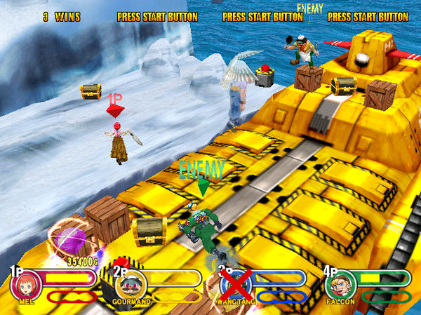 Power Stone 2 pushes too a bit far into Smash Brothers’ territory— four players, auto-scrolling stages, boss enemies, and even more items, losing all connection with its head-to-head fighting roots– and for its efforts becomes so similar to Smash that it can only come off as a low-quality knockoff. The maps are bigger than the original game, yet the characters are slower; absolutely sluggish compared to the original. It takes serious time to move from one end of a room to the other, and the game seems to beg for either a dash move or analog controls. Meanwhile the maps feature massive, constant stage hazards that overshadow the fight, forcing the players to focus their attention entirely upon surviving the level rather than actually fighting each other. Too chaotic to appeal as a real player-versus-player fight, and too slow-moving to provide the raucous party fun of Smash, Power Stone 2 hits a dull medium that doesn’t satisfy in any direction.