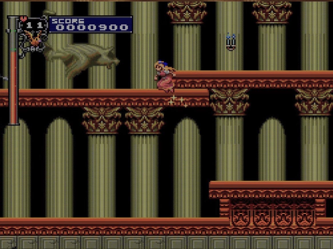 There is a tiny extra you can get in the next room by striking the statues at the top of the screen until they all turn right: a little bag of cash, good only for points and to unlock Boss Rush videos, will fall from the sky.