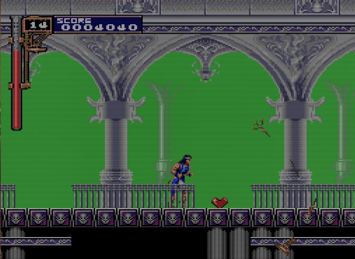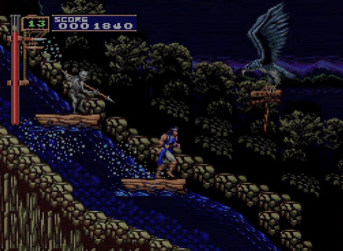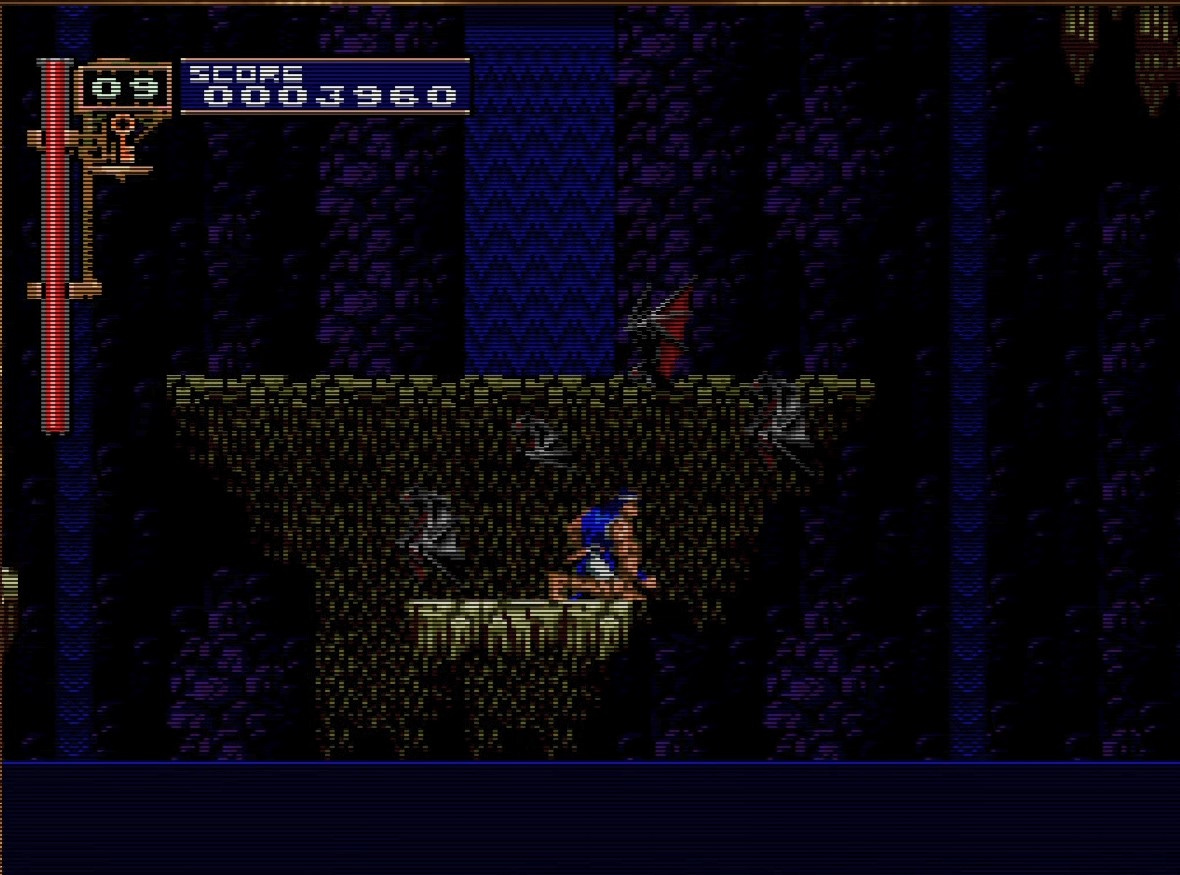 As for this long passage where you stand on a platform and try to dodge oncoming swarms of bats, it’s just kind of mean. You don’t have a sub-weapon here, so you want to stand on the right edge of the platform and crouch as the bats fly overhead. Of course the bats show up the moment you get all the way to the end. Of course they do.