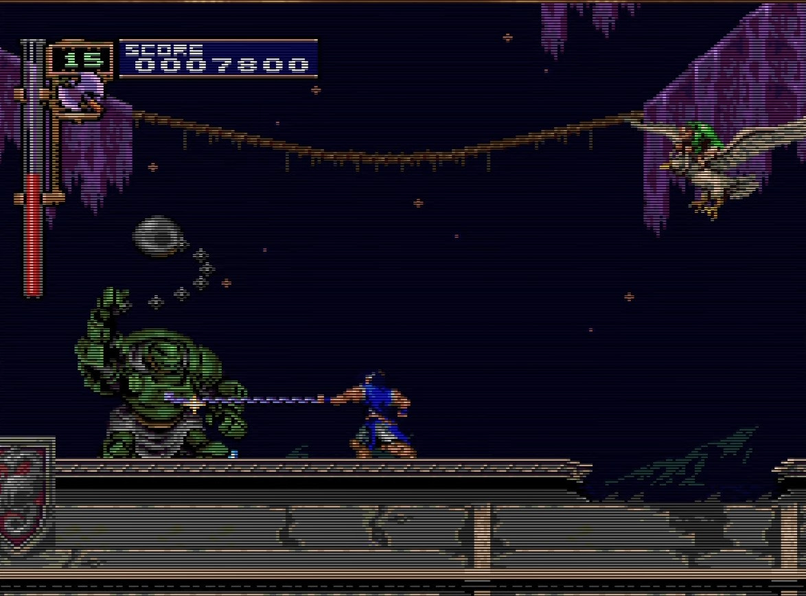 Deal with the armored ball-and-chain dudes in basically the same way you dealt with the smaller ones at the beginning of the stage. Move in, whip a couple times, move back. Flying Flea Men complicate matters, so as usual hit them with axes as soon as they appear.