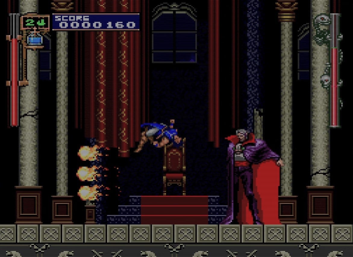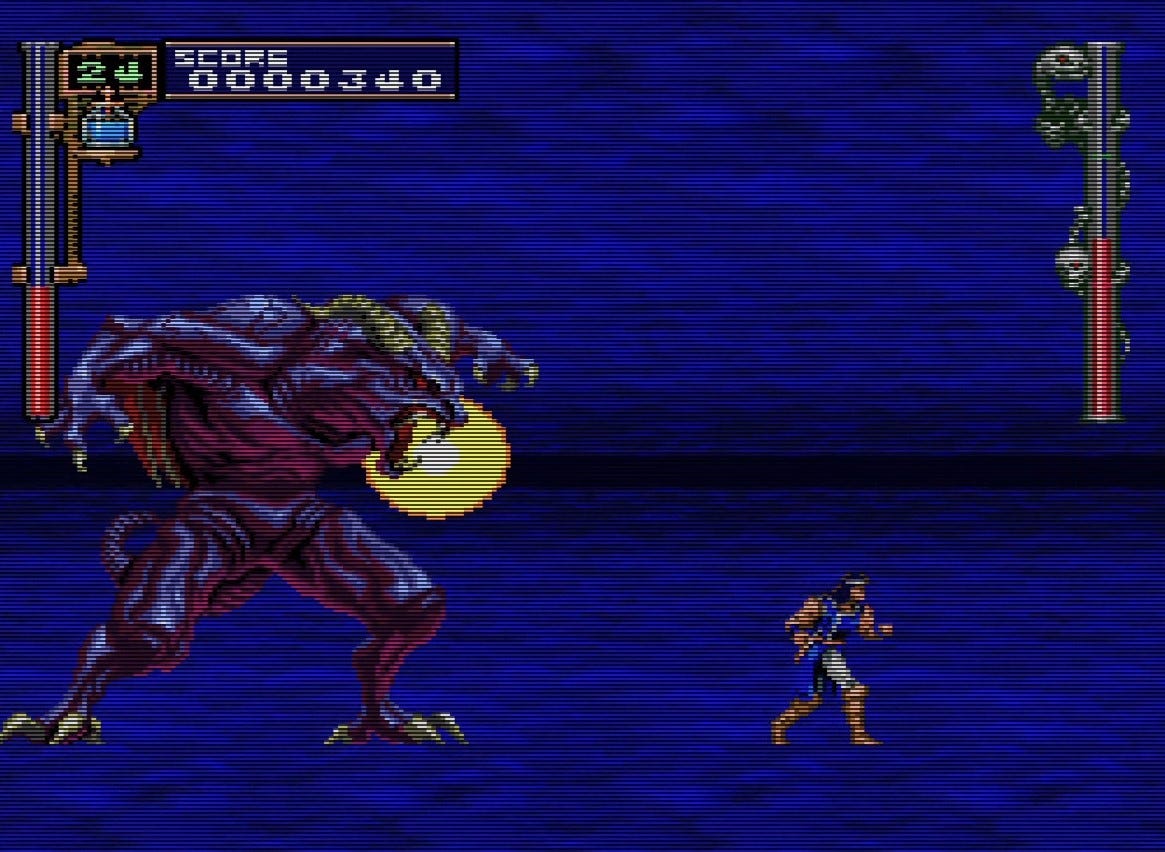 Dracula turns into a massive beast whose main weapon is his bigness. Walking and jumping, he’ll try to force you into a corner and damage you by simply walking into you. The head is still the weak point.