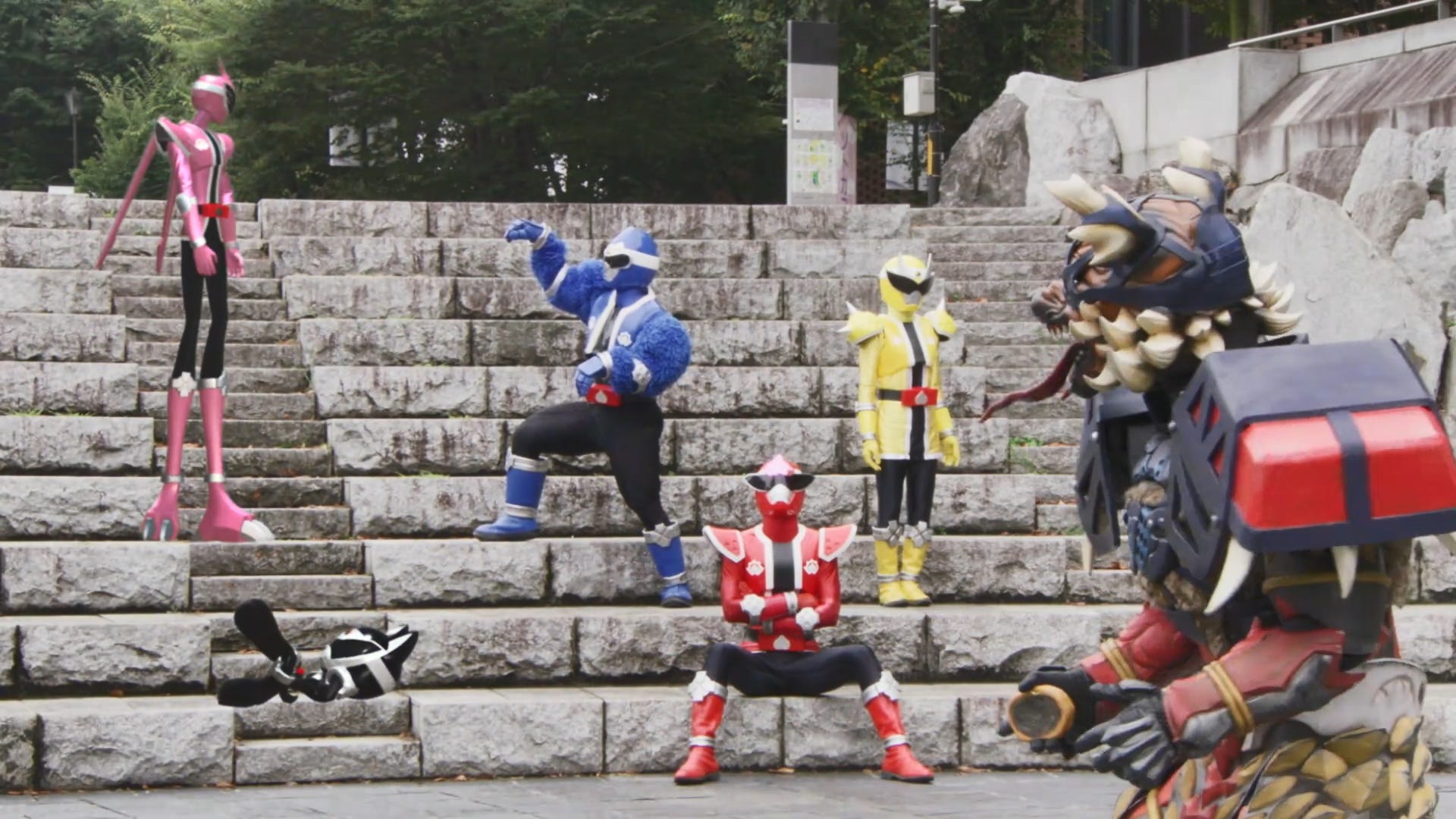 (The black and pink rangers, a small dog and massive pheasant respectively, are completely CG, and it looks strange!)