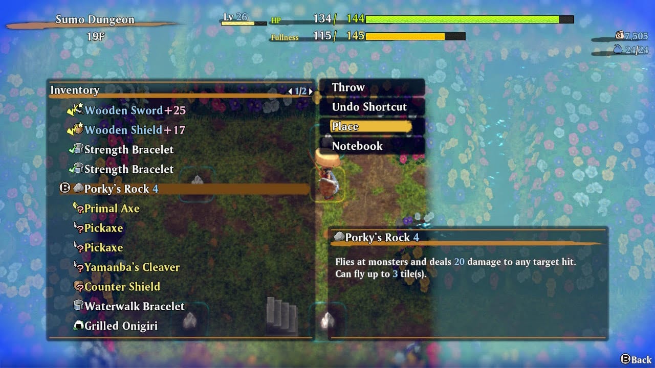 There’s a way around this issue. Find a nice empty room where nothing is going on (this is an important rule in Shiren in general: you don’t want to get interrupted) and start throwing as many rocks out there, in various directions, as you have spots to fill in your Transmute Pot. With arrows you’ll have to be a little more careful: make sure you’re hitting walls and not throwing them down hallways where you can’t pick them back up or accidentally hit something you might not have wanted to hit, like a shopkeeper or other friendly NPC. Once done, put down your existing stack of rocks or arrows on the floor. Do you see where this is going?