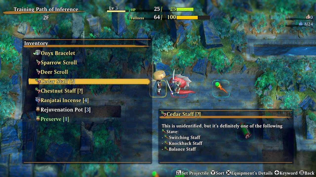 And when you stop and look at the menu, Shiren 6 supplies an actual compendium of that information, a handbook that will tell you all about every item, weapon or monster you have ever encountered in your time playing the game. The developers have effectively built the guide wiki into the game. Often these have vital tips on how to beat a particular monster, or hints on a less obvious way to use an item or magic spell. This game is so full of such tricks that they put one in the trailer. (At about 2:05 behold the result of waving a Fortune Staff at a Hoppin' Hitter.) Finding out one of those tricks is often the difference between life and death.