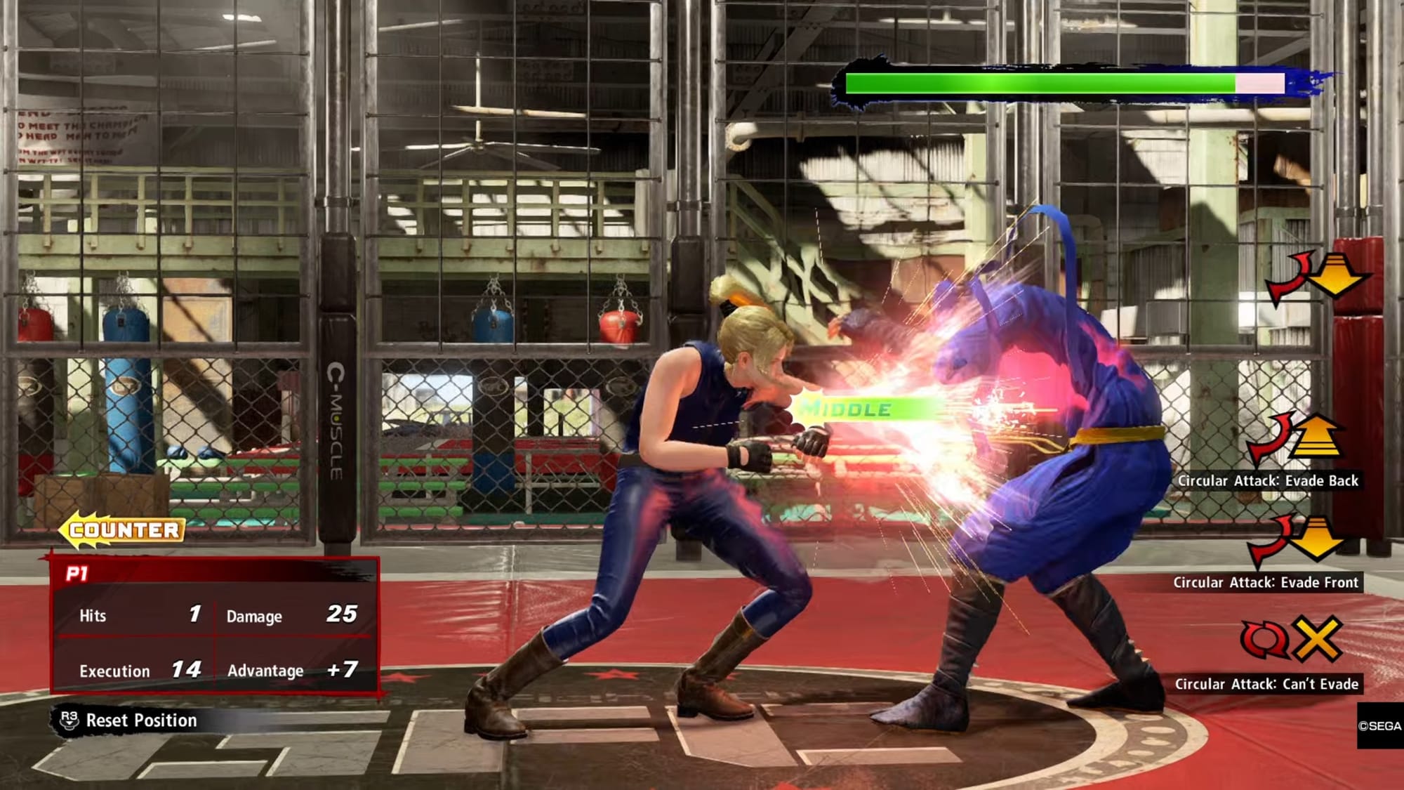 But there’s a big catch here. In Virtua Fighter, throws lose to all attacks for a counter hit. Remember the situation we had before, where the opponent mashes buttons no matter what? That beats throws. It’s a risky tactic— just like using a combo launcher— but if you’re absolutely certain that a player is going to throw, you can make them pay for it with a big strike. Refuse to accept their mental conditioning and clobber them! Or guess wrong and get hit by another mid.