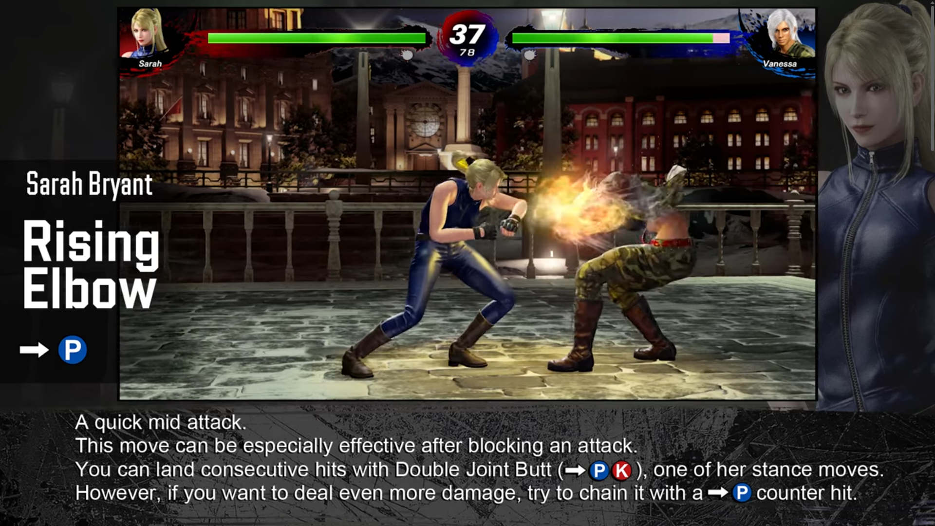 Let’s look at Sarah’s simple 6P elbow. Why Sarah? Because I've played a lot of Sarah, and the kind of setup-oriented offense I'm about to describe is her specialty. Should we land this move, it has an easy follow-up (6P, K) that does a little bit more damage and gets a knockdown. However, if the opponent blocks 6P and we continue with the kick follow-up, we are wide open for a big hit. We must be certain that the first hit will connect before we press the button for the second. That's called a hit confirm, and it's a core fighting game skill.