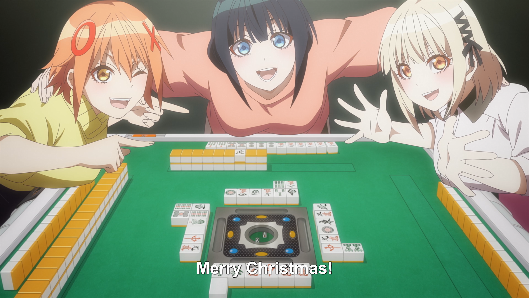 This is another prophetic dream that plays out exactly as depicted here later in the episode. This time the girls make the cheating blatantly obvious because the hand is cute: 111222m222555p77s. That is to say, it’s spelling out 12/25 with two Christmas trees (7s) on top.