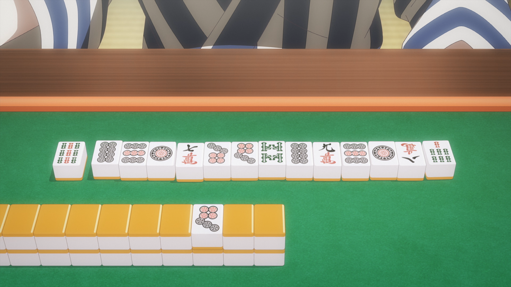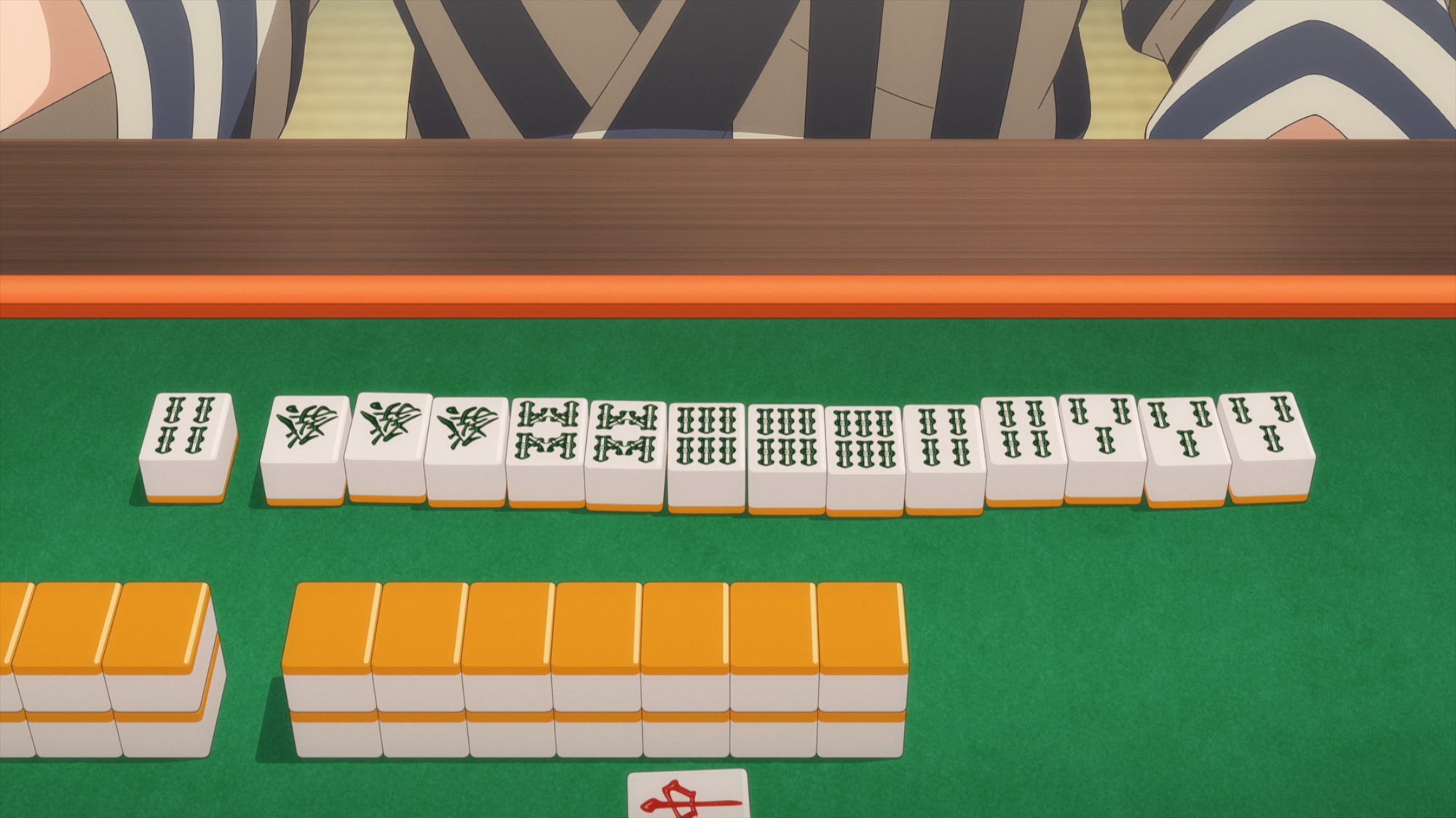 Nashiko, probably unaware both from inexperience and lack of sleep, cuts off Emi’s dream winning hand and pulls a double yakuman. The first criteria it fills is suu ankou: four concealed triples. The second criteria is all green, an American invention: it’s when you make a hand using only tiles containing only green. The catch is that doesn’t mean only hatsu and sou tiles, because the sou tiles with red on them aren’t eligible for all green anymore. So you have to make a hand out of hatsu and only 23468s.