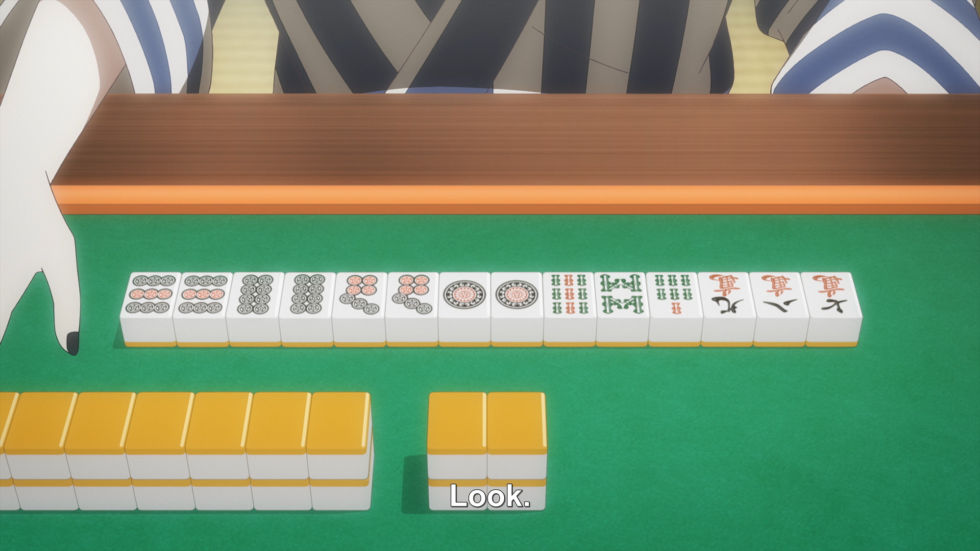 There is some confusion in the subs on “agaru” (to “go out” or win) with regards to mahjong; Nashiko asks something more like “Is that really a winning hand?” after seeing the tiles all mixed up, and Emi replies that it is, before sorting it so everyone can see.