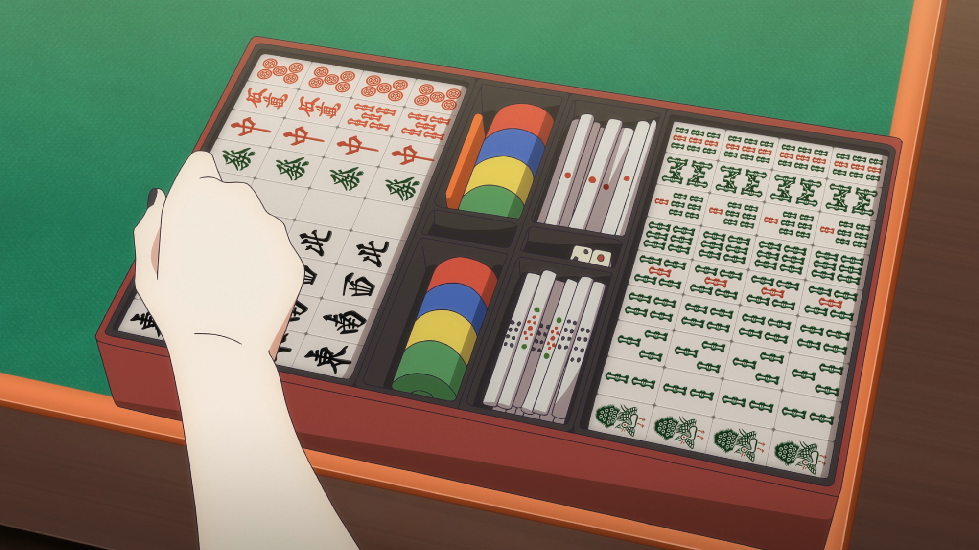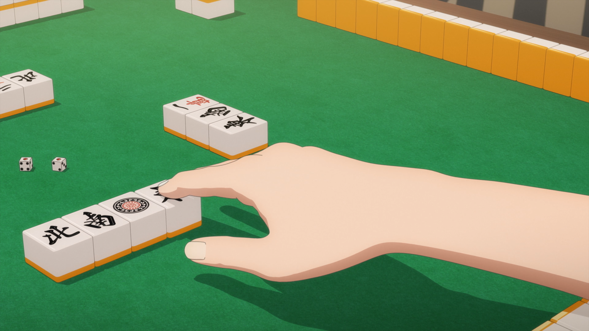 Another classical “cool gambler” mahjong image is the player decisively slamming the tile down on the table with a satisfyingly heavy CLACK as the plastic hits the felt. Though not at all necessary, there’s a certain aesthetic style that players like to discard in. Typically though, you’re not actually slamming the tile the way you see in fiction.