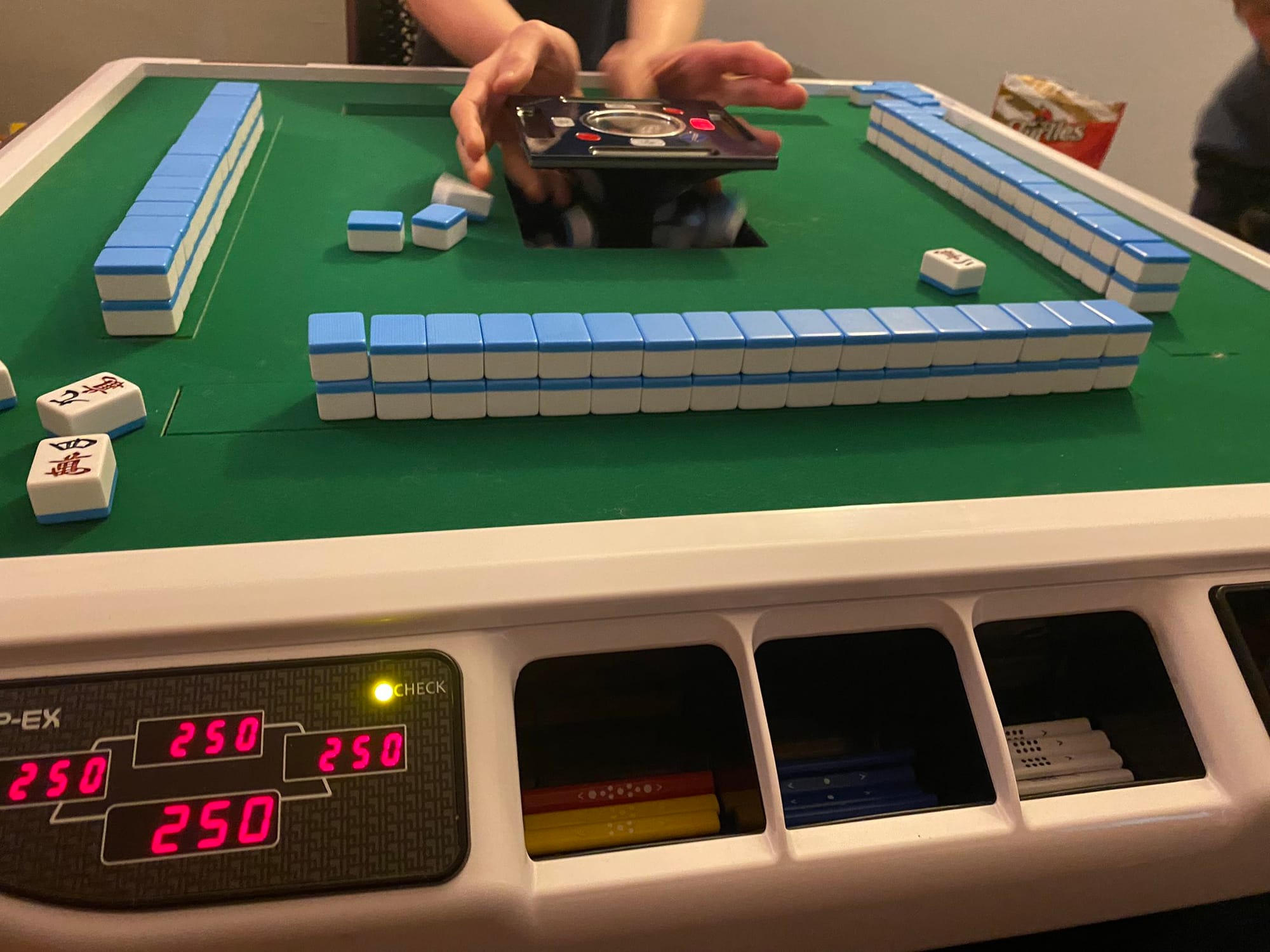 Janta-kun is based on the current standard for consumer automatic mahjong tables, the Amos JP-EX. If this were a real mahjong parlor they wouldn’t be using this table, but of course the people behind this show want to show you something you can buy. (I think Amos is a sponsor. They sure fave my tweets about the show.) If you have several thousand dollars, you’ve gotten tired of hand-shuffling tiles and want to play much faster games, and you want a steady stream of mahjong addicts showing up at your home for games, you might want an auto table.