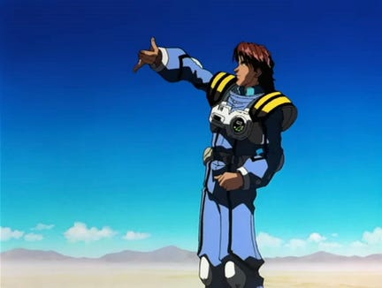 I keep mentioning planes without explaining why. Much of Macross Plus is concerned with an arms development race: two dueling development teams building and testing the best fighter jet/transforming robot they can come up with, in hopes of selling it to the government. Isamu and Guld are rival test pilots, of course, and their fight over Myung extends to the testing field, where both men proceed to lash out by doing very stupid things.