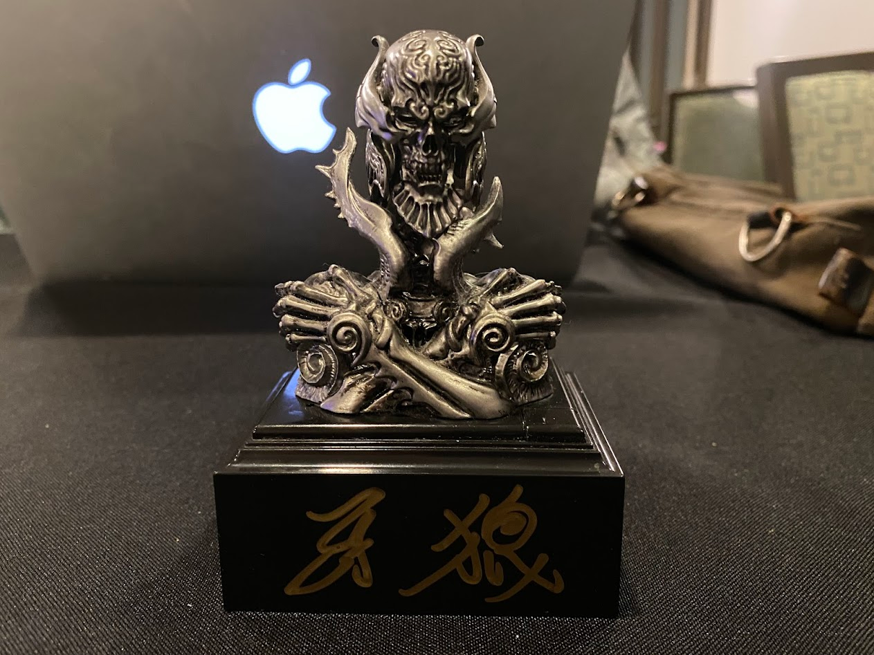I had kind of a tough item to sign, but I knew I didn’t want anything else. My favorite piece of Japanese merch from maybe anything is this talking statue of the demon buddy Zaruba from the Garo series. Using a clever magnet trick, it really opens and closes its mouth to read off a dictionary’s worth of dialogue from the first season in the voice of the legend, Hironobu Kageyama. My talking red-eyed demon skull head is easily the coolest thing I’ve ever owned.