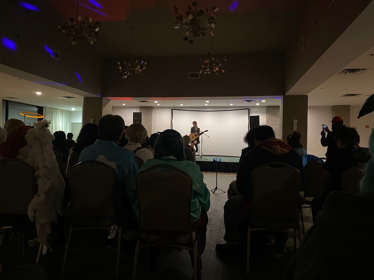 The first big event of the night was a concert with the musical guest Sawa. Also a super-niche guest, her claim to fame is as the vocalist in The World Ends With You soundtrack. This was my first indication that the events up in the ballroom were going to be pretty intimate; this was just Sawa and her guitar in front of maybe 30 people– I'm in the back of the crowd taking this photo– telling her life story and spilling her guts as is her right.