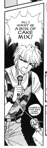 But it’s a callback to a scene in the manga where Cipher sees an ad— this specific ad— for a cake mix on TV and reverts to a toddler as he begs his brother, the household accountant, to buy it for him.