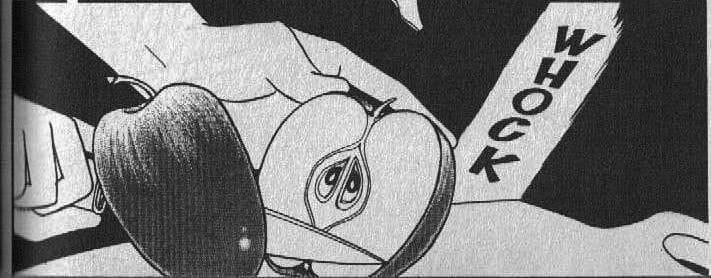 Shot of an apple being sliced in half is from the manga, explicitly a visual metaphor for the twins as two halves of a whole. “Why, God? Why did you… divide one heart so perfectly into two?”