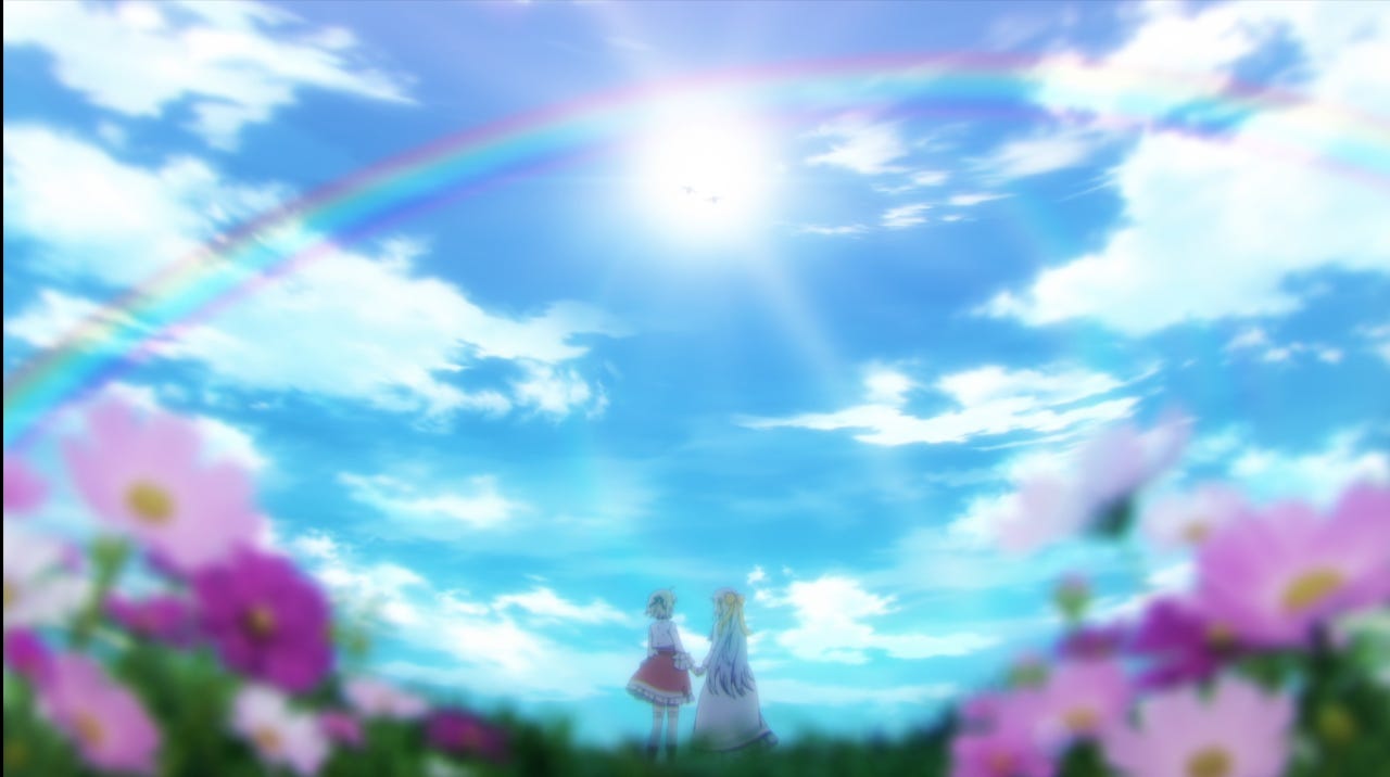 Yuri (lesbian themes/relationships as genre) is kind of in vogue in anime right now, so it’s not exactly surprising that there’s romantic tension between the heroines of this series. But unlike the tiresome teasing of a more cowardly series— like I dunno Lycoris Recoil— Magirevo is open and honest about the girls’ relationship as it develops, in a way that’s truly refreshing. Anis and Euphie have a warmth and a chemistry that flows throughout, and both give deeply of themselves for the other.