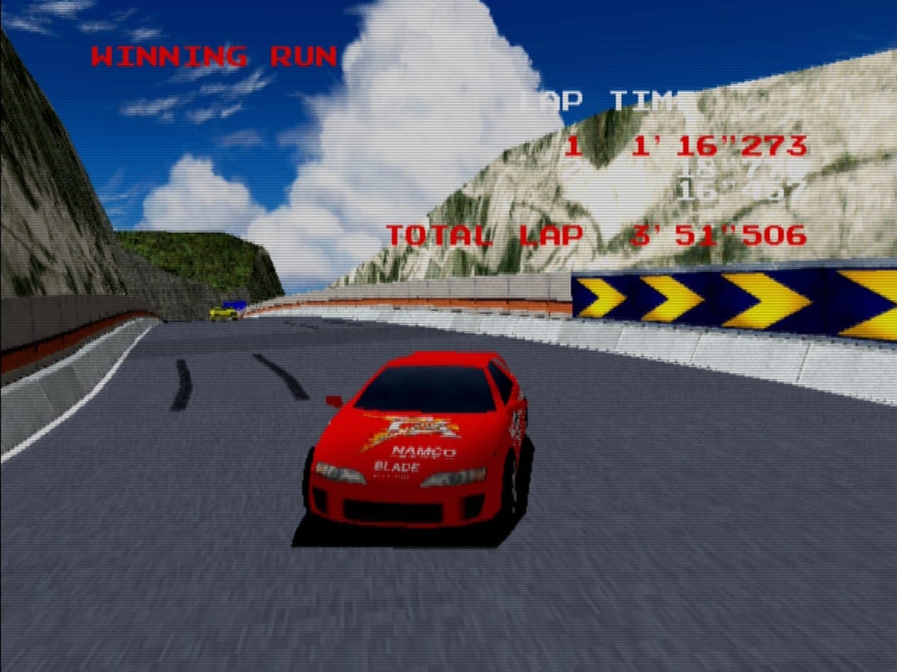 I love the early Playstation library specifically because these concepts are new, novel, and not necessarily worked all the way out. What I'm playing is even rawer than that. In the arcade version of Ridge Racer, you see, there is only one car and one track. You can't even change the position of the camera from the default driver's-eye view. All that stuff would come in the PS1 version, but that's not what we're playing.