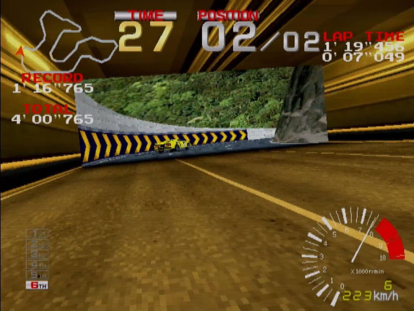 This high-speed hop is exhilarating and feels real on a higher level than the games that have come before. You’ll fly a little higher based on how fast you’re going, and your car’s suspension actually bounces as the tires hit the ground. (Perhaps the arcade version of Ridge Racer only features a driver’s-eye view because the developers wanted players to feel this sensation?) You need to keep the wheel straight, or your tires will skid as you hit the ground with the accelerator on. There were certainly 2D racing games with speed bumps and hops, but this is the beginning of something else. It’s 3D physics in action.