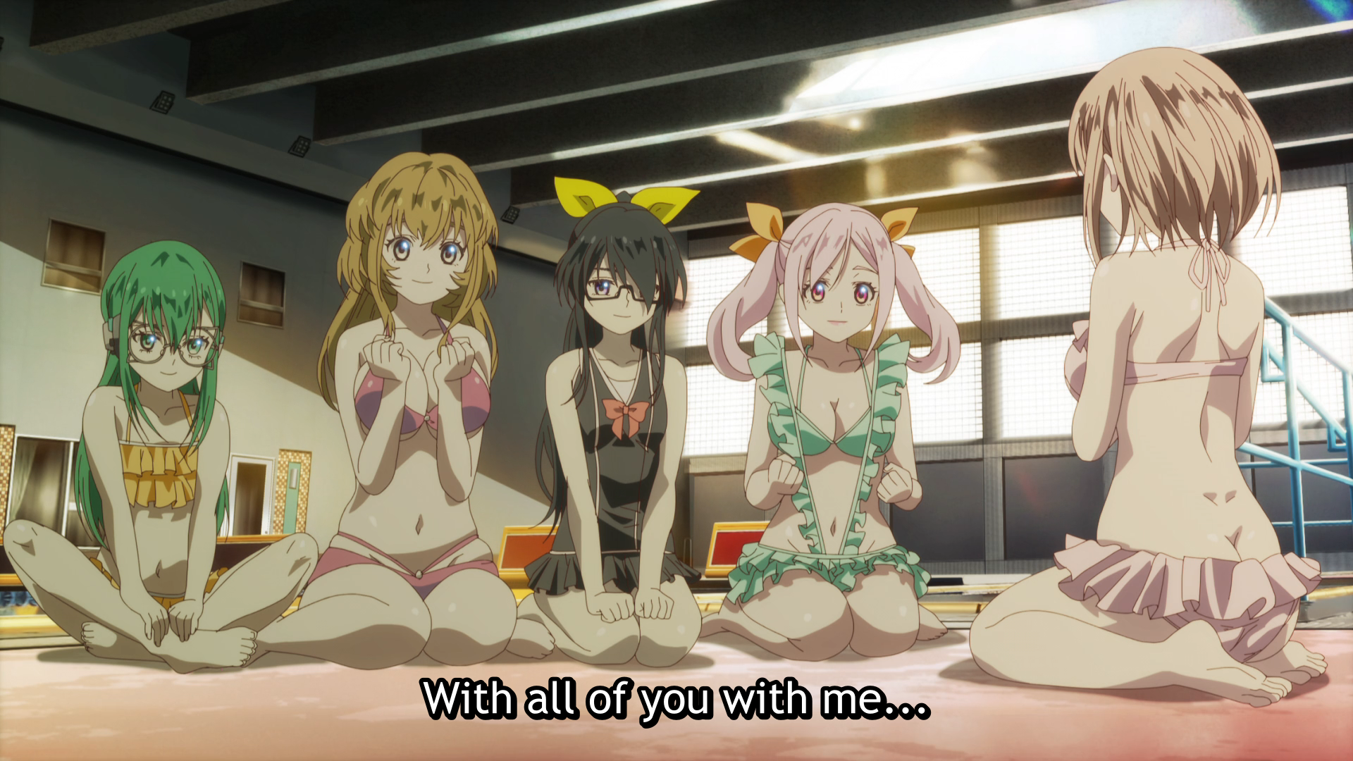 Speaking of horny old men, I want to note that even when a shonen romance polycule heads to the beach, the swimsuits the girls choose— however revealing— tend to reflect their personalities to some degree; you can believe they chose them to wear, and that’s part of the appeal. Momentary Lily does not have that kind of awareness of character; the girls show up at the water park in remarkably porny frilly bikinis sporting open ass-cracks. Finally on a subject it can really get its teeth into, the direction gets really experimental with its camera angles in this episode. A low-flying view of Eri planking (and, not coincidentally, moaning from exertion) is perhaps the most passionately animated cut in a series with plenty of those.