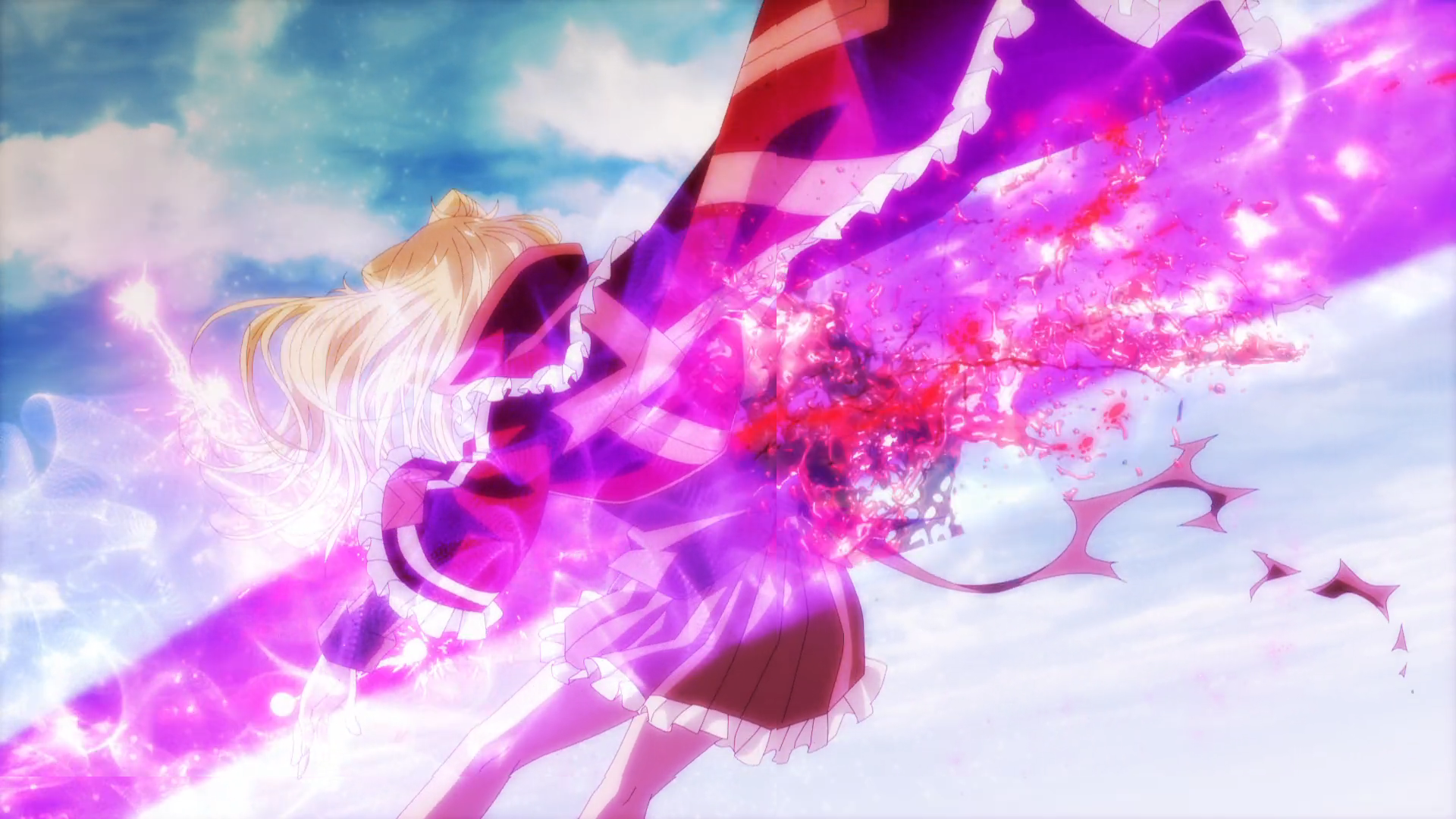 Here’s an innovation award I will hand to Momentary Lily: it accelerates the common anime shock tactic of a “third-episode surprise” to a new level by brutally killing off its main character Yuri— the real main character, the clear leader of the crew, and also the most irritating character by a mile, don don don— in the second episode. (Hence Momentary Lily; Yuri isn’t around for long.) It even goes in first with a fakeout making you think it’s going to rip off Madoka Magica by killing off big sis Eri, complete with an ugly near-death breakdown which displays, solely for shock factor, more sincere human emotion than we ever see out of any character in this show. But Yuri rushes into save the day, and at the moment we’re sure she has, Yuri's premature celebration gets her gut blasted open with a laser beam.