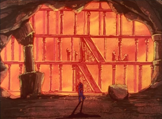 The animators bit off more than they could chew on this one, as you can see in an early version of the animation. It’s tempting to call the rough monochrome animation with red highlights “stylized”, but if you look closely it’s apparent that it’s just not done, a fact which will become more obvious as the series goes on.