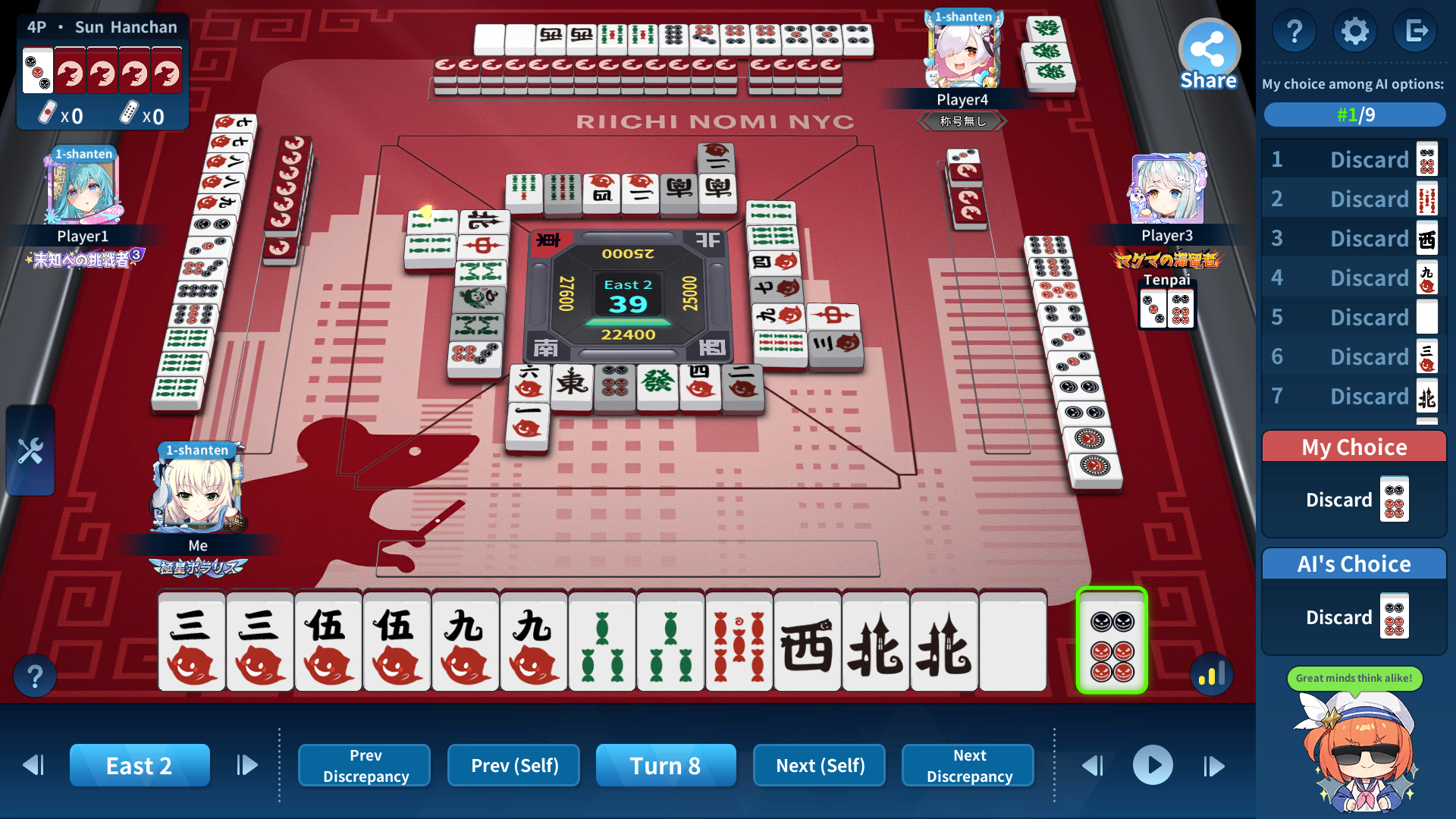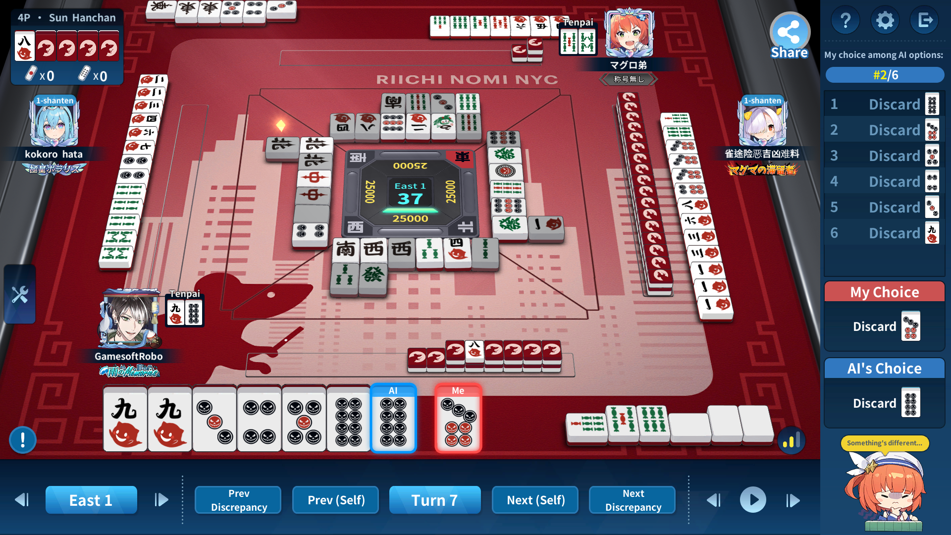If you’re stumped by a choice the AI made, don’t be afraid to ask other players. It’s possible that a more experienced player will see a possibility that you didn’t. There is a big mahjong Reddit that of late mostly fields these questions about riichi, and the dedicated mahjong discords also have spots for this kind of thing.