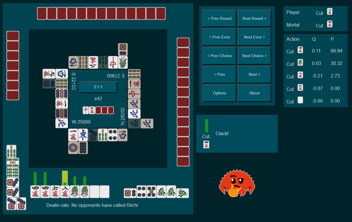 But don’t take the AI rating as a rating of your play. Even the authors of Mortal have said to be wary of this accuracy rating, and not to judge the quality of your play by how accurate it is to Mortal. Mortal plays mahjong better than you do, but it’s just a model; or, you could say, it’s just another player. And like players, even the various AIs (Naga, Suphx, LuckyJ) have different play styles.