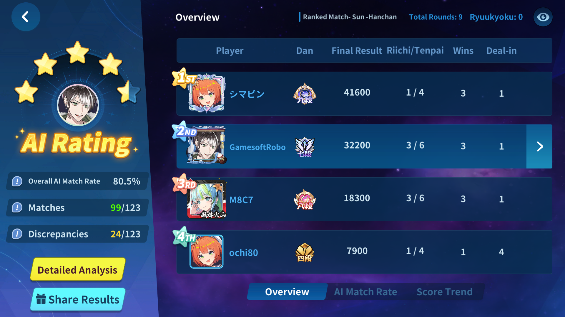 Riichi City has recently implemented Mortal directly into the game, so you can run 4p matches you’ve played directly into the AI and see what it has to say about your play without even leaving the app. I was always able to run Mortal on my RC game logs, but I use it a lot more now that I have such easy access to it. (It costs a microscopic amount of in-game vouchers to scan a log, or if you use the RC “monthly mascot” you can scan ten a day, which makes the cost negligible.)