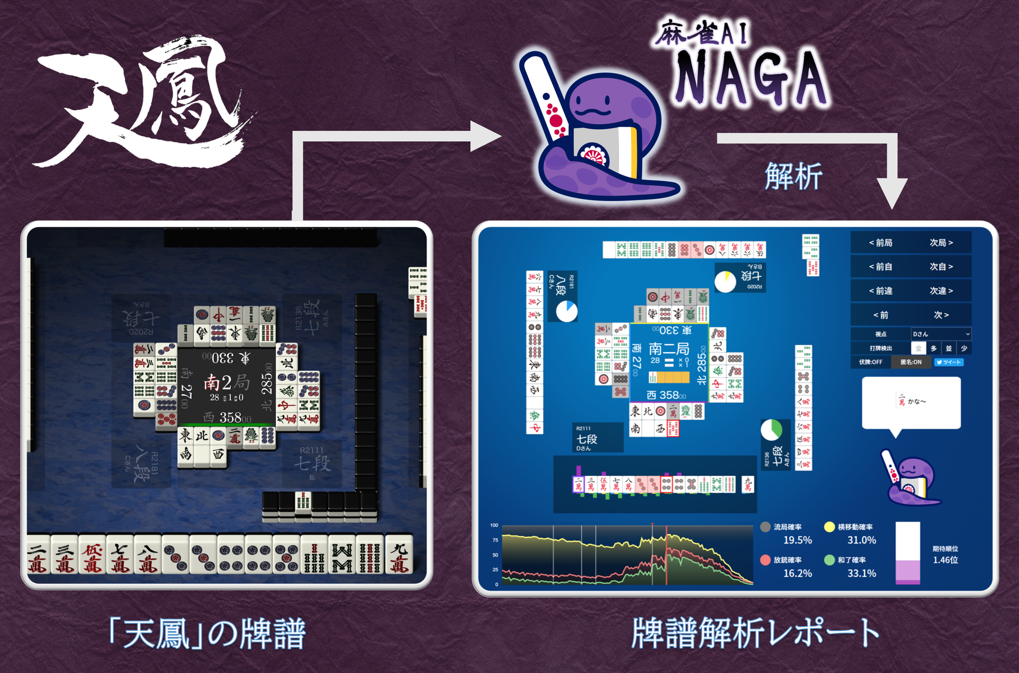 Lately, a lot of riichi players have been studying with the help of AI models trained by processing many, many games: basically, virtual experts. The Naga model was the first on the market, but without a Nicovideo account, some basic knowledge of Japanese and a way to pay it, you’ll have a tough time using it. The model most English speakers use is Mortal, which is open source. Either app will read your Tenhou, Mahjong Soul, or Riichi City (Mortal only) logs and analyze them turn-by-turn, telling you where the model would have made a different decision given the information at hand.