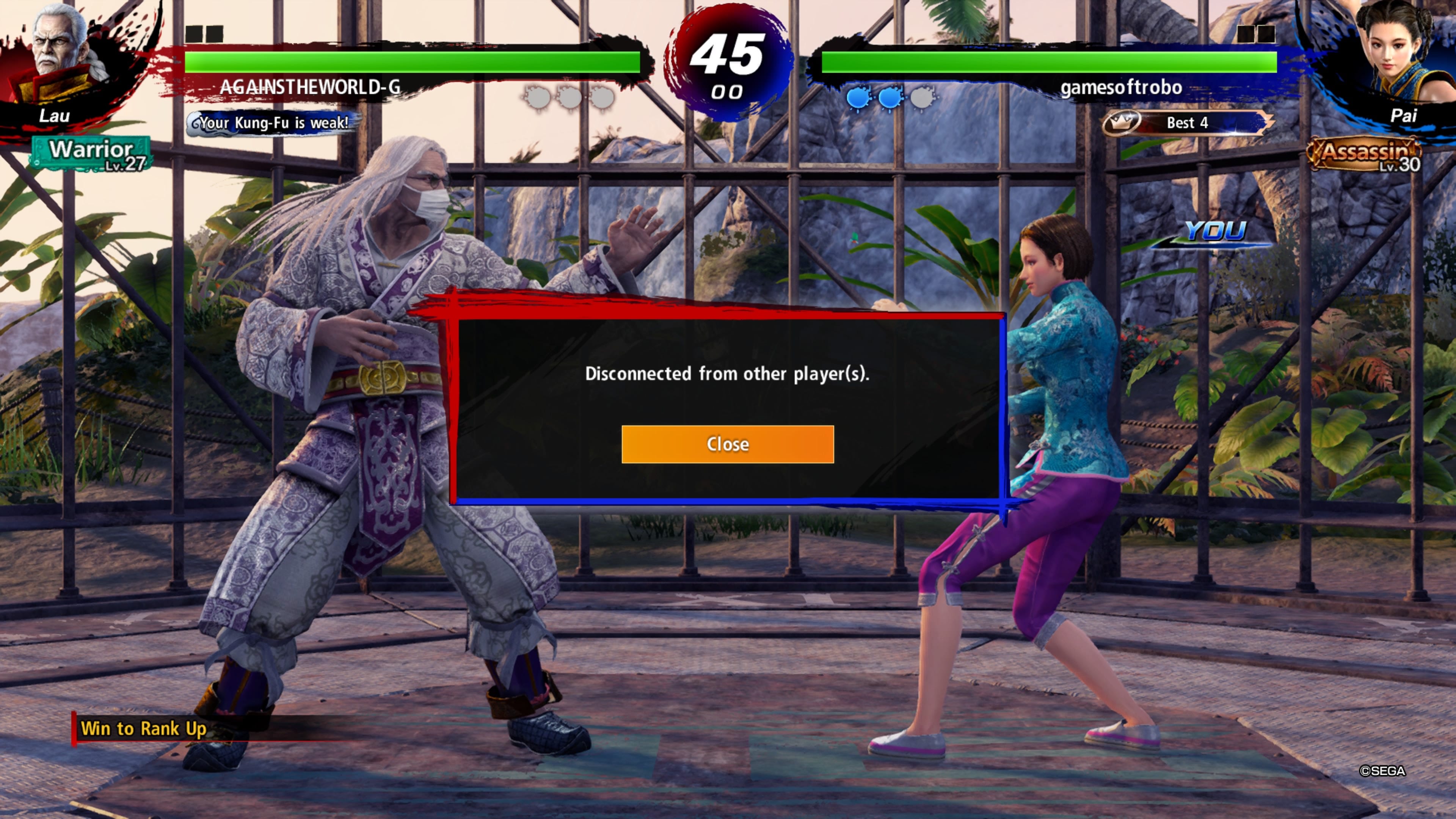 However, I do love VF5 when it comes down to it— I’ve only been playing it for what, fifteen years now?— So I recently returned to Ultimate Showdown to see how things were going. When I left, the initial rush of players was just about gone. With fewer players spread further out— and a rank system that isolates them further— what few matches I got were laggy enough to turn me away from the game altogether.