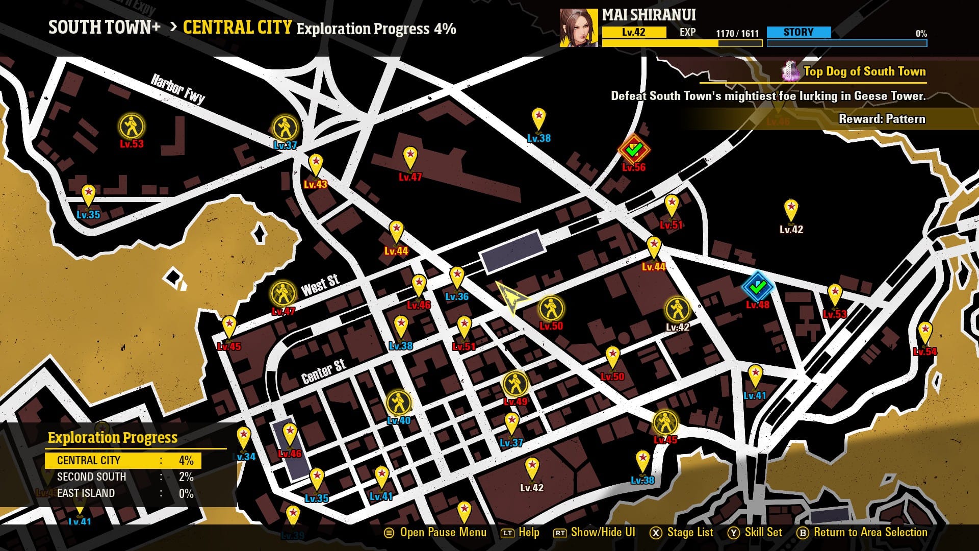 In addition to that, another way SNK plays catch-up with Street Fighter here is the full single-player RPG mode. But City of the Wolves doesn’t have the budget (guess that all went to marketing) or the scope to do a completely separate free-roaming RPG mode like SF6. Instead, you have a much simpler RPG similar to the World Tour mode in the old Street Fighter Alpha 3 home versions (if you're old enough to remember those). Pick a location on the map, have a fight there, get a prize. As far as the story component, I was able to get through it with Mai in a couple of hours by just rushing through the important fights (for which I was deliberately under-leveled). But the grind and unlockables— including new looks for the game’s color edit mode— go on for significantly longer.