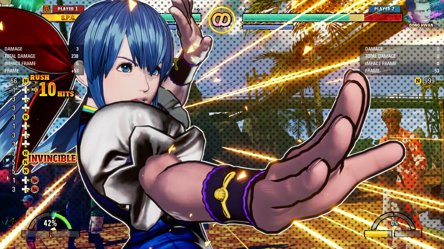 As for myself, I’ve mostly been playing Dong Hwan, the goofier of Kim Kaphwan’s two sons. (Note his name sounds like Don Juan; he’s a bit of a failure playboy.) In addition to just being a fun dork, Dong Hwan has tricky movement in the air— including a powerful dive kick ala Cammy– and nasty offense up close using various feints and fake-outs that keep him attacking over and over again. He needs to get in, but starting at medium range he starts to get really scary. He’s a great “style points” character; in fact his whole personality is “style points”.